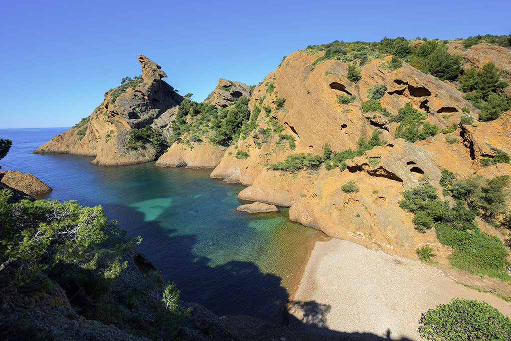 Calanque de Figuerolles : crique de galets bordée de pins, roches de poudingue et eaux claires, parfaite pour la plongée en apnée et la détente.