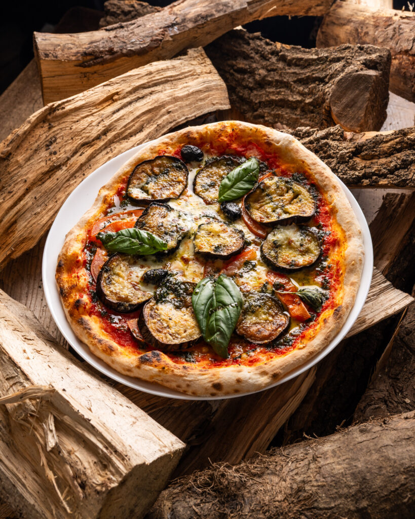 Sauce tomate, mozzarella fior di latte, aubergines, tomates fraîches, copeaux de parmesan